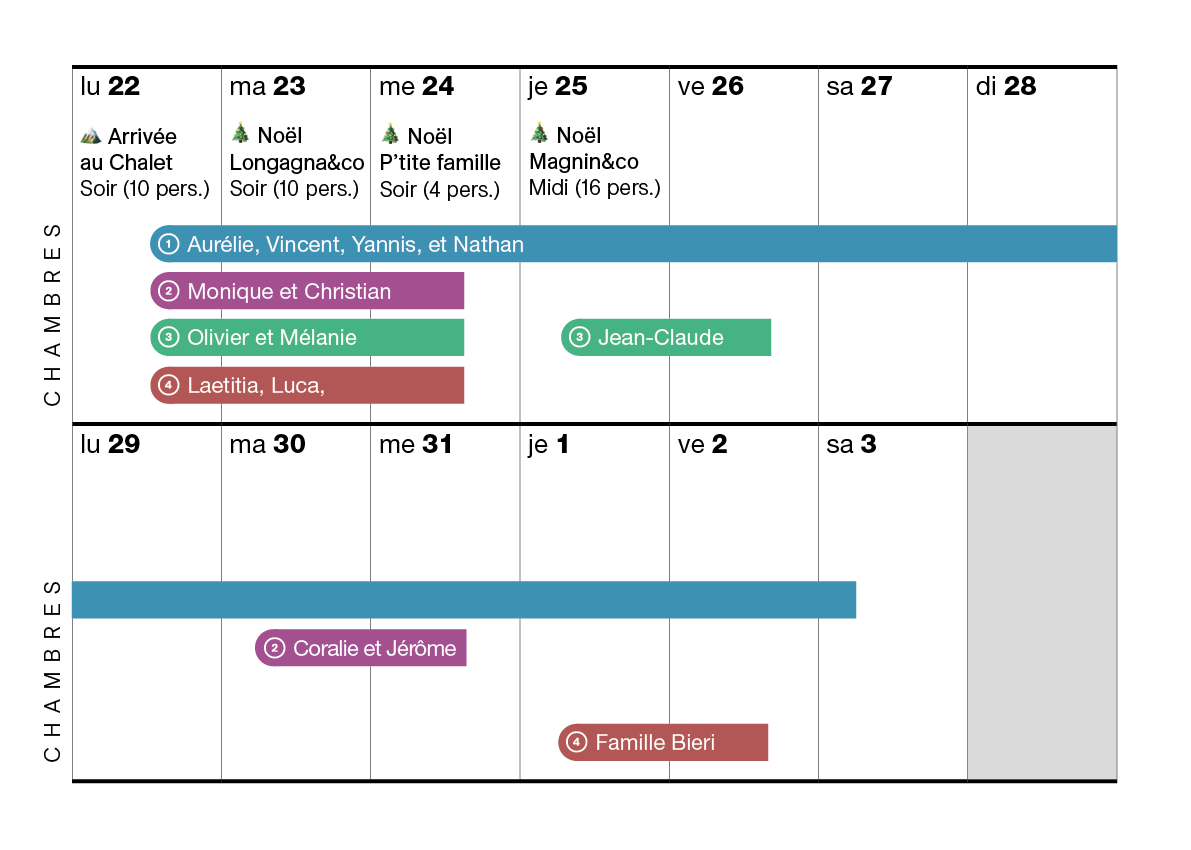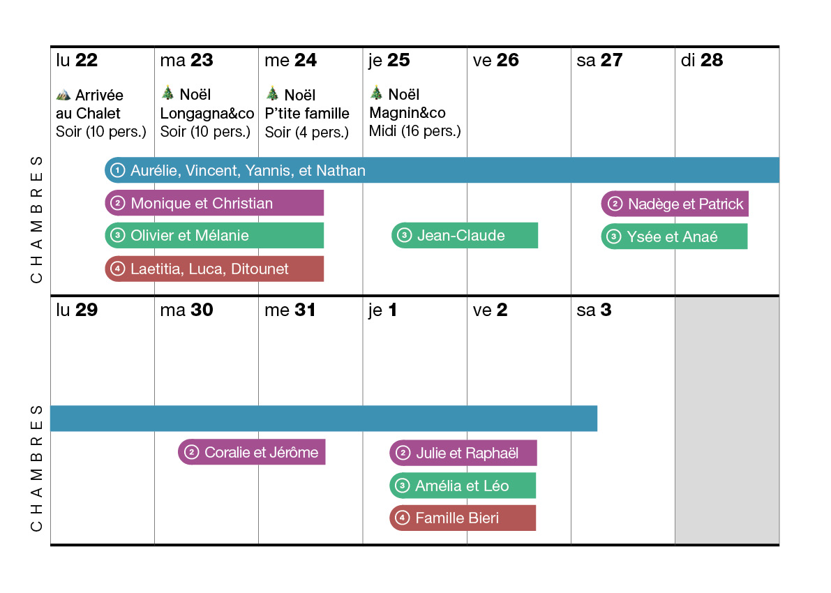 Pour vous aider à choisir, vous pouvez consulter les informations ci-dessous : vous y trouverez les trois chambres disponibles ainsi que le planning de venue des invités.